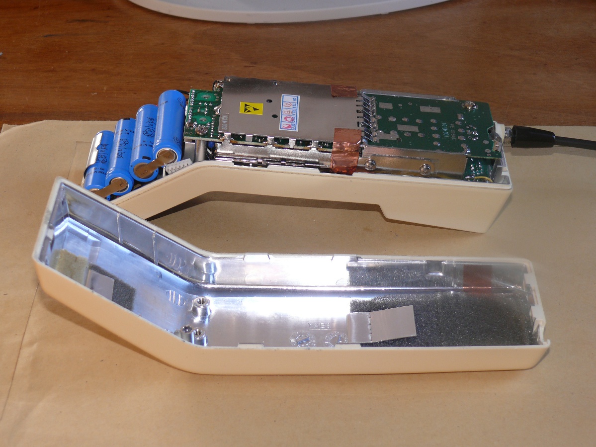 Hier sehr gut zu sehen: Der Handapparat wird nur durch Nasen gehalten oben und unten. Man trennt die beiden Hälften,